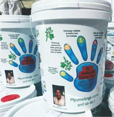 The Premier spearheaded a Covid-19 screening campaign in Nkangala’s Dr JS Moroka municipality on Wednesday a week ago. Buckets of sanitisers branded with her face and the logo of the Mpumalanga provincial government were distributed to the needy citizens.